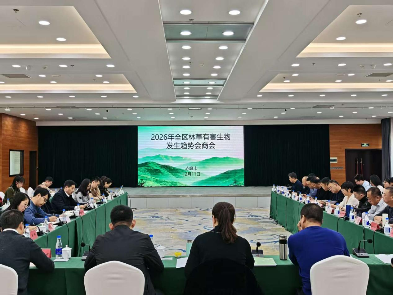 自治区防治检疫总站组织召开2026年全区林草有害生物发生趋势会商会, 12月11日,自治区防治检疫总站在赤峰市组织召开2026年全区林草有害生物发生趋势会商会。全区各盟市和内蒙古大兴安岭森工集团防治机构负责人、测报业务骨干共计50余人参加了会议。 会上,敖汉旗林草局围绕本地林草有害生物精准监测、科学防控实践作了典型经验介绍。各地防治机构围绕2025年工作亮点、存在问题及下一步工作思路进行了交流研讨,防治总站针对各地提出的问题进行了答疑。与会人员综合2025年林草有害生物发生和防治情况、越冬基数、发生规律及特点,结合气象条件会商了2026年全区林草有害生物发生趋势。最后,防治检疫总站负责人全面总结了“十四五”我区林草有害生物监测与防控工作取得的成绩,系统分析了当前面临的形势和任务,明确了“十五五”全区林草有害生物防控整体工作思路,并围绕2026年防控重点工作,从着力强化松材线虫病预防,着力强化监测预警,着力强化林业植物检疫,着力强化林草有害生物防控,着力强化联防联治,着力强化基础设施建设,着力强化风险防范意识,着力强化培训宣传等八个方面提出了明确要求,为做好2026年防治工作,实现“十五五”良好开局奠定了扎实基础。