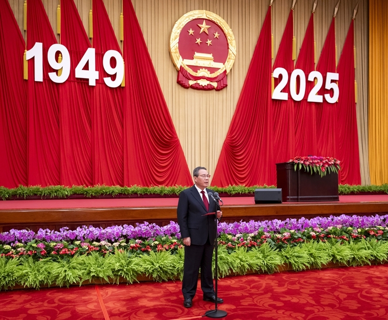 庆祝中华人民共和国成立76周年招待会在京举行 习近平发表重要讲话, 庆祝中华人民共和国成立76周年招待会在京举行习近平发表重要讲话李强主持 赵乐际王沪宁蔡奇丁薛祥李希韩正出席9月30日晚,庆祝中华人民共和国成立76周年招待会在北京人民大会堂举行。中共中央总书记、国家主席、中央军委主席习近平出席招待会并发表重要讲话。新华社记者 燕雁 摄新华社北京9月30日电 庆祝中华人民共和国成立76周年招待会30日晚在人民大会堂举行。中共中央总书记、国家主席、中央军委主席习近平出席招待会并发表重要讲话。他强调,实现中华民族伟大复兴是前无古人的伟大事业。憧憬和挑战,都激发我们只争朝夕、永不懈怠的奋斗精神。我们要更加紧密地团结在党中央周围,锐意进取、埋头苦干,奋力谱写中国式现代化更加绚丽的篇章。李强主持招待会,赵乐际、王沪宁、蔡奇、丁薛祥、李希、韩正出席招待会。约800名中外人士欢聚一堂,共庆中华人民共和国华诞。人民大会堂宴会厅华灯璀璨,洋溢着喜庆热烈的节日氛围。主席台上方高悬着庄严的国徽,“1949-2025”大字年号在鲜艳红旗映衬下格外醒目。17时30分许,在欢快的《迎宾曲》中,习近平等党和国家领导人步入宴会厅,向大家挥手致意,全场响起热烈掌声。9月30日晚,庆祝中华人民共和国成立76周年招待会在北京人民大会堂举行。习近平、李强、赵乐际、王沪宁、蔡奇、丁薛祥、李希、韩正等党和国家领导人与中外人士欢聚一堂,共庆中华人民共和国华诞。新华社记者 谢环驰 摄招待会开始。全场起立,高唱中华人民共和国国歌,雄壮的《义勇军进行曲》在大厅回荡。习近平发表重要讲话。他首先代表党中央和国务院,向全国各族人民、向中国人民解放军指战员和武警部队官兵、向各民主党派和无党派人士致以节日祝贺,向香港特别行政区同胞、澳门特别行政区同胞、台湾同胞和海外侨胞致以诚挚问候,向长期以来关心和支持中国建设事业的友好国家和国际友人致以衷心感谢。习近平指出,新中国成立76年来,党领导人民自力更生、接续奋斗,取得彪炳史册的辉煌成就。回望历史,中华民族从濒临危亡走向伟大复兴,一路筚路蓝缕、充满艰辛,也一路豪情满怀、凯歌高奏。前不久,我们隆重纪念中国人民抗日战争暨世界反法西斯战争胜利80周年,极大振奋了民族精神、激发了爱国热情、凝聚了奋斗力量。要继续用好历史经验,把国家建设得更好,让老一辈领导人和革命先烈开创的事业不断欣欣向荣。习近平强调,今年以来,面对复杂形势,我们进一步全面深化改革,扎实推动高质量发展,着力保障和改善民生,纵深推进全面从严治党,党和国家各项事业取得新进展新成效。下个月,我们党将召开二十届四中全会,研究制定“十五五”规划建议。要紧紧围绕新时代新征程党的中心任务,把“十五五”发展的目标任务和战略举措规划好实施好,确保基本实现社会主义现代化取得决定性进展。习近平指出,新征程上,我们要坚定不移贯彻“一国两制”方针,支持港澳更好融入国家发展大局,更好发展经济、改善民生。要深化两岸交流合作,坚决反对“台独”分裂行径和外部势力干涉,坚决捍卫国家主权和领土完整。习近平强调,面对百年变局加速演进的国际形势,我们要大力弘扬全人类共同价值,践行真正的多边主义,推动落实全球发展倡议、全球安全倡议、全球文明倡议、全球治理倡议,同各国携手构建人类命运共同体。9月30日晚,庆祝中华人民共和国成立76周年招待会在北京人民大会堂举行。中共中央政治局常委、国务院总理李强主持招待会。新华社记者 翟健岚 摄在欢快的乐曲声中,中外宾朋举杯共贺中华人民共和国成立76周年,祝福中国繁荣昌盛、人民幸福安康,祝愿中国人民和世界各国人民友谊长存。出席招待会的还有:在京中共中央政治局委员、中央书记处书记、全国人大常委会副委员长、国务院副总理、国务委员、国家监察委员会主任、最高人民法院院长、最高人民检察院检察长、全国政协副主席和从领导职务上退下来的同志,以及中央军委委员、曾担任中央军委委员的同志。中央党政军群有关部门和北京市负责人,各民主党派中央、全国工商联负责人和无党派人士代表,在京功勋荣誉表彰奖励获得者代表,全国劳动模范和先进人物代表,为民族地区稳定、发展、团结作出重要贡献的少数民族代表人士,在京部分香港特别行政区人士、澳门特别行政区人士、台湾同胞和华侨、华人代表,各国驻华使节、各国际组织驻华代表、部分外国专家等也出席了招待会。
