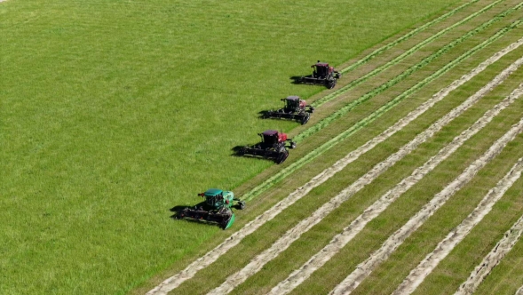 眼下,内蒙古兴安盟科右前旗褪去了盛夏的浓绿,染上了成熟的金黄。在满族屯满族乡的千亩草场上,6台打草机轰鸣着来回穿梭,草屑随秋风扬起又落下,转眼就化作一个个紧实的草捆……