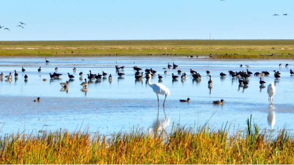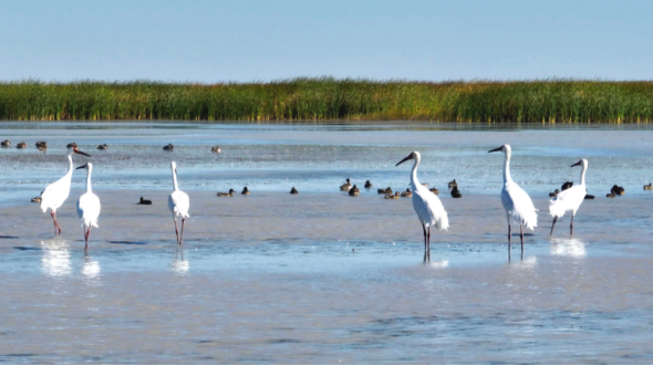 深秋时节,气温渐降,大批南迁候鸟陆续飞抵兴安盟。往日静谧的湖泊与河岸,因这些“远方来客”变得热闹非凡。白鹤舒展修长羽翼掠过波光粼粼的水面,小天鹅成群结队在湖中嬉戏打闹,丹顶鹤迈着优雅步伐在岸边寻觅食物,白额雁、豆雁则集群停歇休憩。万鸟齐栖的生动场景,构成一幅幅灵动鲜活的生态画卷,为深秋的兴安大地注入了蓬勃生机。