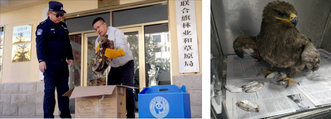 近日,包头市达茂旗林草局野生动物保护工作人员接到农牧民求助电话分别到西河乡、达尔罕苏木与当地政府人员、边境派出所民警共同救助两只国家一级保护动物草原雕。