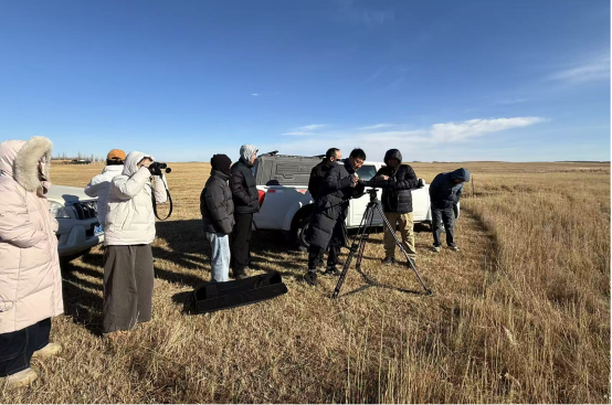 在大鸨栖息繁殖地,全体党员干部携带望远镜、照相机、无人机等工具,在当地爱鸟护鸟志愿者的引导下开展实地调查。大家严格遵循监测规范,仔细观察记录大鸨的数量、活动轨迹、集群状态信息,并与爱鸟护鸟志愿者交流监测保护工作经验。