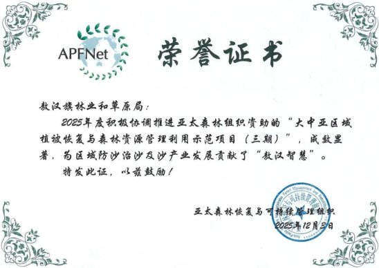 敖汉旗获亚太森林组织通报表彰, 近日,亚太森林恢复与可持续管理组织发文,通报表彰赤峰市敖汉旗林业和草原局、三义井林场在2025年度“大中亚区域植被恢复与森林资源管理利用示范项目(三期)”中的显著成效,肯定其为大中亚区域生态修复提供了可复制、可推广的实践样本,为全球荒漠化防治事业贡献了重要力量。据了解,敖汉旗与该示范项目的结缘始于2017年。当年,敖汉旗正式承接“大中亚区域植被恢复与森林资源管理利用示范项目”中国项目区示范区建设任务,核心实施区域落户三义井林场。项目以防治科尔沁沙地荒漠化为核心目标,敖汉旗林草系统高标准推进一、二期工程建设,均高质量完成任务,并于2023年末顺利通过验收评估,为项目接续推进积累了宝贵经验。2024年4月,三期项目在三义井林场接续启动实施。敖汉旗林草局抽调精兵强将组建专项团队,在总结前两期成功经验的基础上,进一步扩大示范范围、完善示范内容。项目总投资1015万元,其中亚太森林恢复与可持续管理组织资助800万元,地方配套215万元。通过营造固沙林、穿沙路防护林、封沙育林育草等核心举措,项目实现了沙地植被的有效保护、恢复与扩大,同步提升了沙地森林植被质量,从根源上改善了荒漠化地区生态环境。目前,三期项目已完成多项重点建设任务:300亩沙地植被恢复示范林的补水、抚育及管护工作全面落地;150亩沙生树木示范园景观树种配置提升工程顺利完工;建成75亩沙地林下综合示范基地,探索林业产业融合发展路径;配套建设特色蒙古包1座、星空泡泡屋3座、帐篷10顶,完善露营体验设施;开展项目人员能力建设培训1次,覆盖100人,并组织国内交流学习活动2次,全方位提升项目实施团队专业能力与示范辐射效应。敖汉旗林草局负责人表示,下一步敖汉旗林草局将通过营造固沙林、穿沙路防护林和封沙育林育草等措施,保护恢复扩大沙地植被,改造提升沙地森林植被多样性,建成乔灌草相结合的优质高效生态经济模式,有效治理荒漠化土地,从根本上改善地区生态环境。综合利用沙地资源,在项目区建设沙地宣教示范基地1处、沙地光伏发电站1处。同时,建设沙地体验项目,为周边地区群众提供一个度假、休憩、科学教育、文化娱乐的场所,促进人口、资源、环境和谐发展,实现经济效益、生态效益和社会效益三效统一。