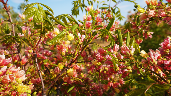 文冠果花堪称“北疆奇花”,素有“弄色芙蓉”雅称,每年5月如期绽放,花期长达20余天,最绝是“同树不同花”——一株树上能开出黄、粉、红等渐变花色,初绽如霜雪覆枝,盛放似绯云漫卷,终落若紫霞缀枝,满树繁花芬芳弥漫,兼具瘦、拙、艳、香之美,观赏价值极高。作为中华传统吉祥庭院树,文冠果树冠开阔、树形优美,可人工塑形造景,是赤峰创建园林城市、建设美丽乡村的优良树种。