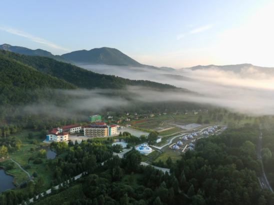 航拍喀喇沁旗亚太森林多功能体验基地,青山云雾环绕,建筑错落林间。