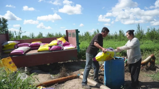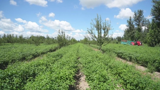 乌力吉木仁苏木苏布日根塔拉嘎查方雪家有200亩林地,栽植了鸡心果、沙果、苹果等多种果树。走进她家的果树林,高大的果树郁郁葱葱,鸡心果、沙果等果实挂满枝头,树下的红干椒长势正旺。今年,经过逐级上报审批,方雪在林下种植了120亩红干椒。这两天,趁着晴好天气,她正在给红干椒冲施最后一遍平衡肥,为红干椒的良好长势保驾护航。